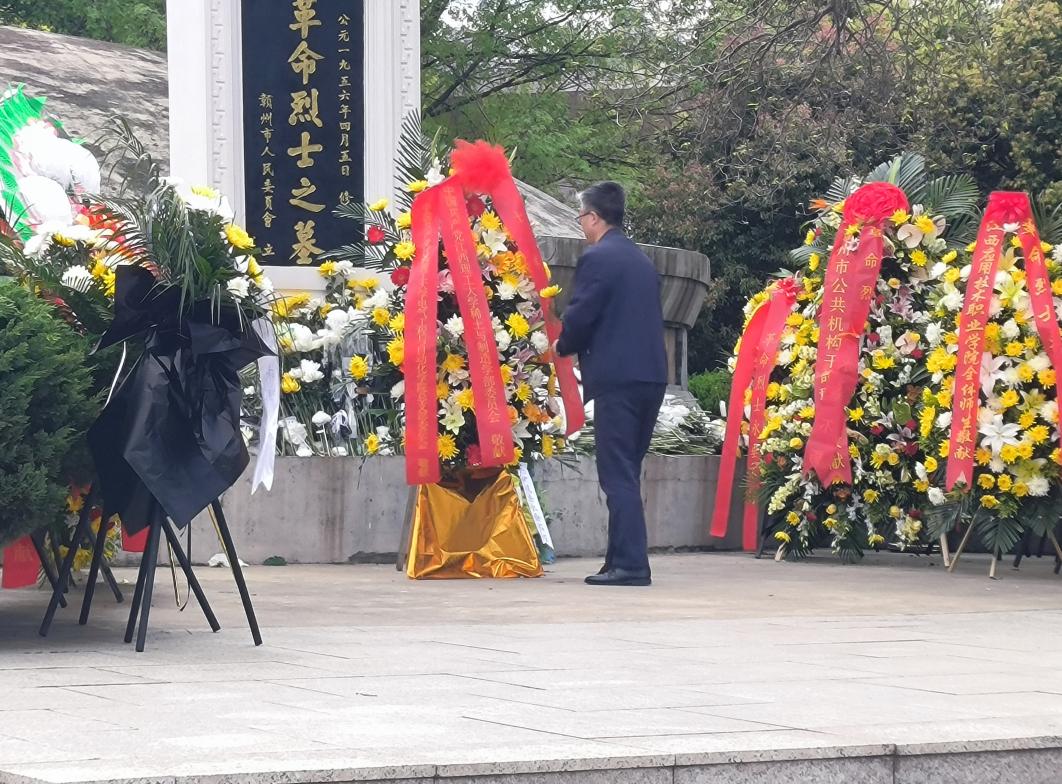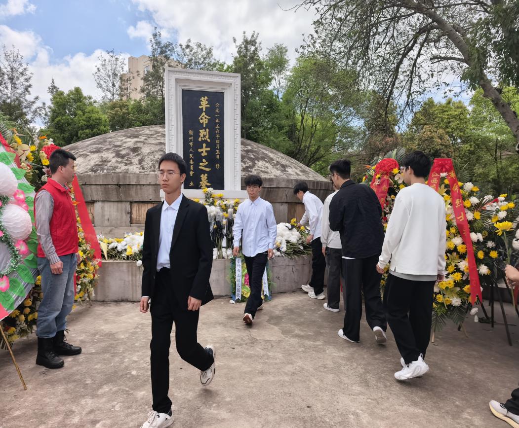 四名学生党员代表迈着稳健的步伐,抬起花篮,缓缓走向革命烈士纪念碑,将花篮敬献于碑前。稀土与制造学部党委书记于仲安仔细整理花篮缎带,代表全体师生向革命英烈致以最崇高的敬意。