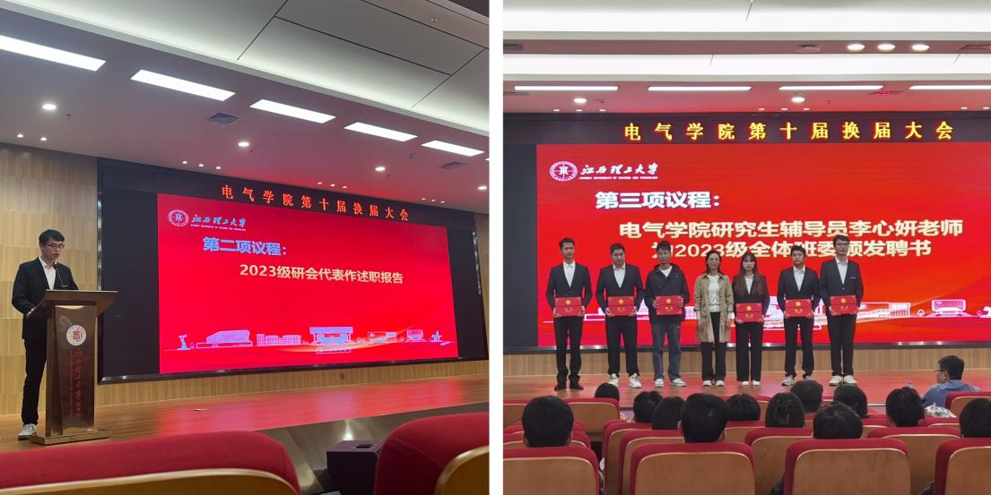 大会伊始,由第九届研会代表曾阳剑对过去一年的研会工作进行总结汇报,同时也对未来的研会发展提出了展望。接着由陆荣双老师和李心妍老师为电气学院23级研会成员及班委颁发聘书。