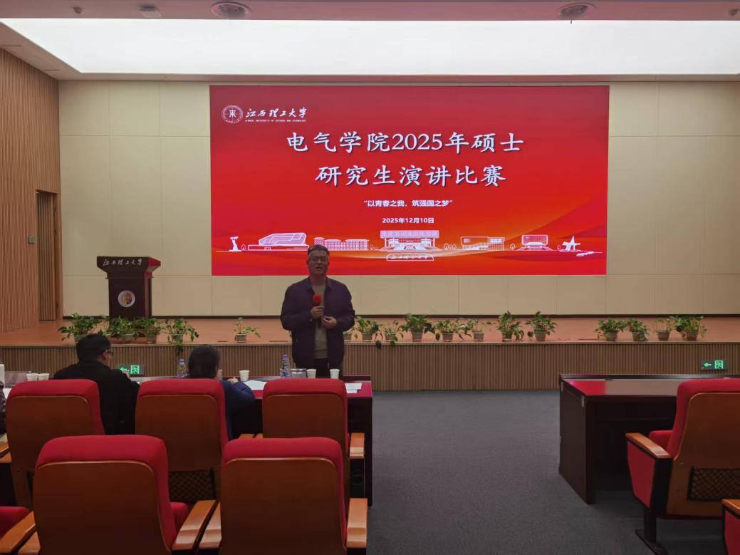 为提升研究生表达能力和思辨能力,展现新时代青年对于强国的深刻思考,电气学院于12月10日在三江校区志远报告厅成功举办了以“以青春之我,筑强国之梦”为主题的演讲比赛决赛。学院党委书记于仲安、教工第一党支部书记曾璐、本科生辅导员张晶璇、研究生辅导员李心妍和2025级研究生班主任丰富出席了本次活动并担任评委,25级全体硕士研究生到场观赛。