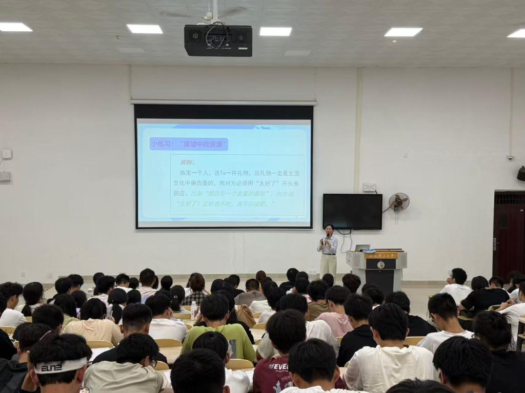 讲座伊始,郭老师结合大学生学业、人际、就业等现实场景,系统阐释了压力的心理学定义及其双重属性——适度的压力可激发潜能,而长期过载则可能引发身心问题。通过压力源分类,郭老师引导同学们从学业负担、家庭期待、自我认同等维度分析压力成因,用通俗易懂的语言和贴近学生生活的案例,让在场同学对压力有了清晰且科学的认知。