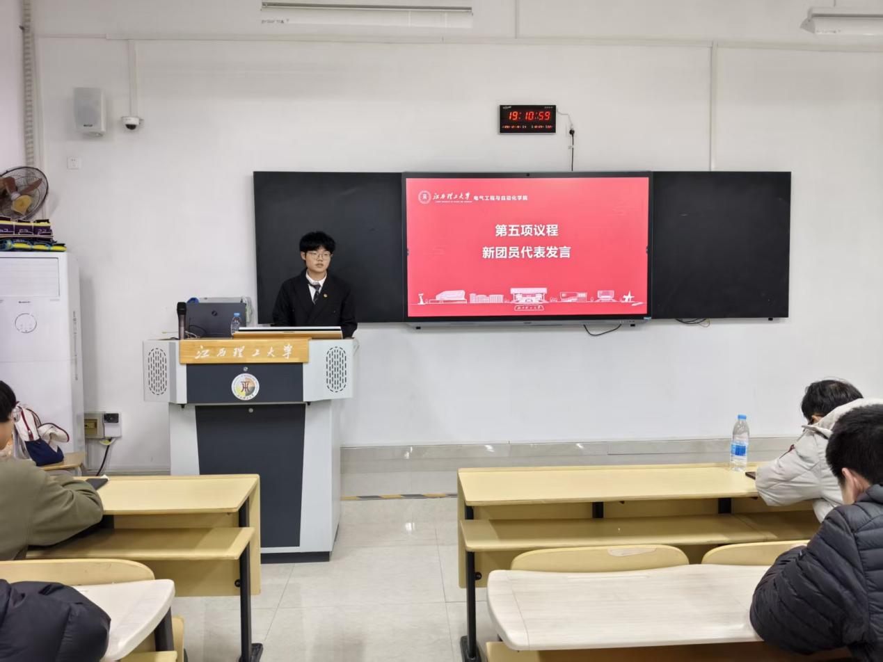 宣誓礼毕,新团员代表马钿翔上台发言。他表达了加入共青团的激动与自豪,并郑重承诺:将牢记入团誓词,在今后的学习和生活中以团员的标准严格要求自己,刻苦钻研专业知识,积极参与社会实践,锤炼过硬本领,发挥先锋模范作用,用实际行动践行青春誓言,不辜负团组织的信任与期望。