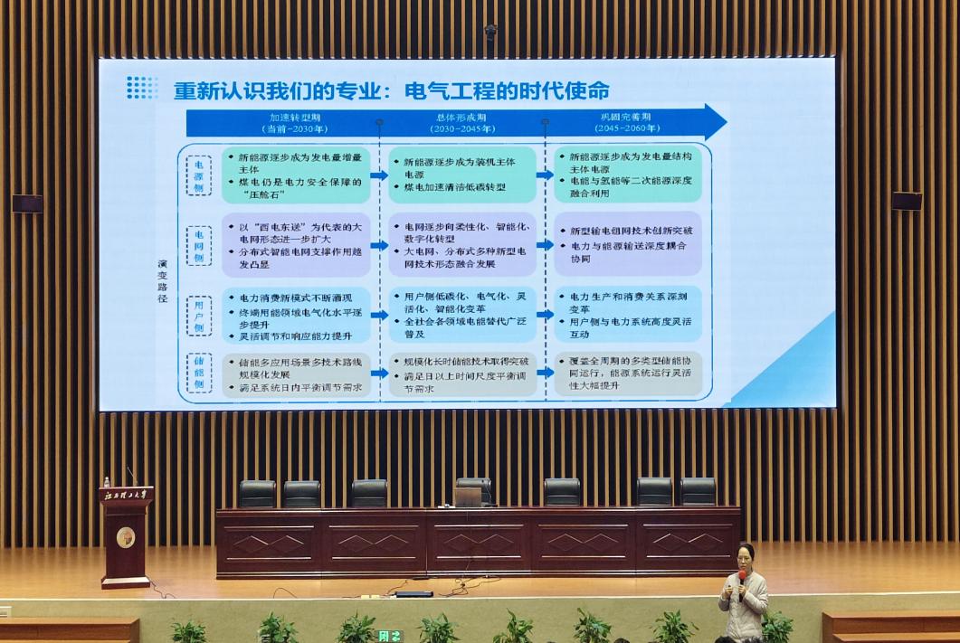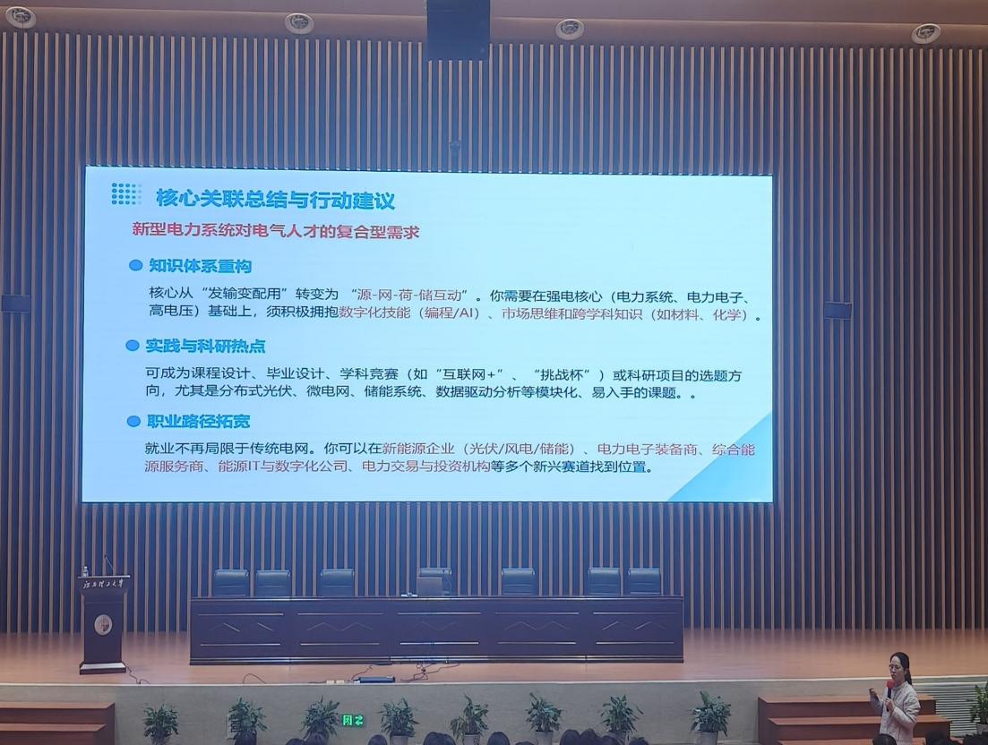 讲座伊始,辛妍丽副教授聚焦当前行业“新浪潮”,从不同领域结合自身科研实践解读电气工程发展趋势与技术挑战,她通过与学生提问交流的方式总结了风力发电和光伏发电的不足之处,电力系统正在经历颠覆性的变革并由此阐明了其与本科核心课程的关联。她提出,在日新月异的发展下,同学们需要走出舒适区,广泛涉猎和学习,唯有主动拓宽知识面、挖掘多元潜力,才能将所学知识融会贯通,为长远发展奠定基础。